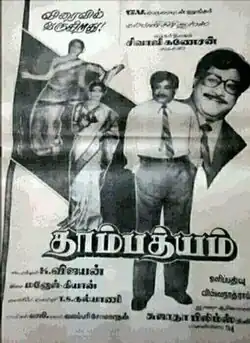Thambathyam (transl. Intimacy) is a 1987 Indian Tamil-language film, directed by K. Vijayan and produced by T. S. Kalyani. The film stars Sivaji Ganesan, Ambika and Radha.[1] It is a remake of the Telugu film Dampatyam.