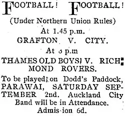 - ^ "Matches At Thames". New Zealand Herald. Vol. LIII, no. 16316. 24 August 1916. p. 10. Retrieved 24 May 2023.
