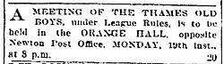 The 1916 season saw Thames Old Boys once again field a second-grade and third-grade side. They held their annual meeting on 10 April at the Orange Hall in Newton once again. Their secretary prior to the meeting was J. Mangan who had placed the meeting advertisement.[22]