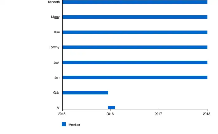 The group was still composed of seven members until the quiet departure of Gab Bayan in December 2015. Bayan left the group in order to return to Far Eastern University and to focus on his studies.[2] Without any formal announcement, JV Suzara, a contestant in That's My Bae: "Twerk It" Dance Contest who finished as a semi-finalist, was added to the group as a replacement.