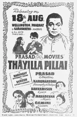 Thayilla Pillai (transl. The Motherless Child)[2] is 1961 Indian Tamil-language drama film directed and co-produced by L. V. Prasad and written by M. Karunanidhi from a story by S. R. Pinisetty. The film stars T. S. Balaiah and M. V. Rajamma, with G. Muthukrishnan, Kalyan Kumar, S. Rama Rao, Manohar, L. Vijayalakshmi, Madhuri Roy, Sandhya and T. P. Muthulakshmi in supporting roles. It revolves around a mother torn between her love for her orthodox Brahmin husband and her son.