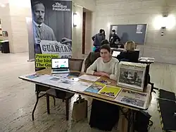 In a November 2018 Guardian article, Luke Harding and Dan Collyns cited anonymous sources which stated that Donald Trump's former campaign manager Paul Manafort held secret meetings with WikiLeaks founder Julian Assange inside the Ecuadorian embassy in London in 2013, 2015, and 2016.[144] The name of a third author, Fernando Villavicencio, was removed from the online version of the story soon after publication. The title of the story was originally 'Manafort held secret talks with Assange in Ecuadorian embassy'. A few hours after publication, 'sources say' was added to the title, and the meeting became an 'apparent meeting'.[145] One reporter characterised the story, "If it's right, it might be the biggest get this year. If it's wrong, it might be the biggest gaffe." Manafort and Assange both said they had never met, with the latter threatening legal action against The Guardian.[146] Ecuador's London consul Fidel Narváez, who had worked at Ecuador's embassy in London from 2010 to July 2018, said that Manafort had not visited Assange.[145]