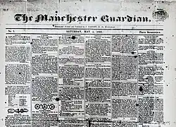 The influential journalist Jeremiah Garnett joined Taylor during the establishment of the paper, and all of the Little Circle wrote articles for the new paper.[27] The prospectus announcing the new publication proclaimed that it would "zealously enforce the principles of civil and religious Liberty ... warmly advocate the cause of Reform ... endeavour to assist in the diffusion of just principles of Political Economy and ... support, without reference to the party from which they emanate, all serviceable measures".[28] In 1825, the paper merged with the British Volunteer and was known as The Manchester Guardian and British Volunteer until 1828.[29]