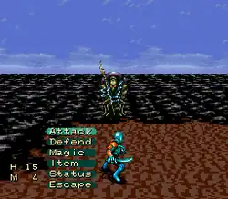 Battles in the game are turn-based. When the player character is in battle, the perspective shows the character and ally, if any, from behind looking at one to three enemies. Players then select an action and take turns with the enemy and ally. The player can attack, defend, cast a spell, use an item, or run. If the player wins, their characters get experience points, gold, and occasionally items. If they lose, half of their money will be gone. If the player loses to one of the other main characters, their rune(s) will be taken by that character. Gaining experience results in attaining levels which improve a character's skill. Buying better weapons and armor with the money improves a character's fighting ability.