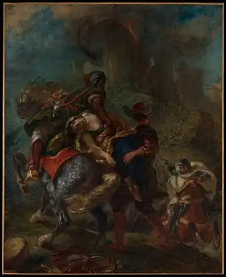 The Abduction of Rebecca is a mid-19th century painting by French artist Eugène Delacroix. Done in oil on canvas, the work depicts the a scene from Sir Walter Scott's novel Ivanhoe in which the heroine Rebecca is abducted. Delacroix produced the painting during the height of the French Romanticist Movement, and presented the work at the Paris Salon of 1846. The 1846 version of Abduction is currently in the collection of the Metropolitan Museum of Art, which describes the work as "one of Delacroix’s greatest paintings".[1] In 1858 Delacroix created an almost identical work for the Paris Salon of 1859; the second version of Abduction is in the collection of the Louvre.[1]