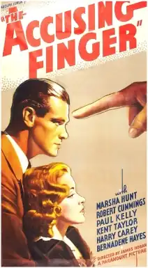 The Accusing Finger is a 1936 American drama film directed by James P. Hogan and written by Madeleine Ruthven, Brian Marlow, John Bright and Robert Tasker. The film stars Paul Kelly, Marsha Hunt, Kent Taylor, Robert Cummings, Harry Carey, Bernadene Hayes and Joe Sawyer.[1] The film was released on October 23, 1936, by Paramount Pictures.[2][3]