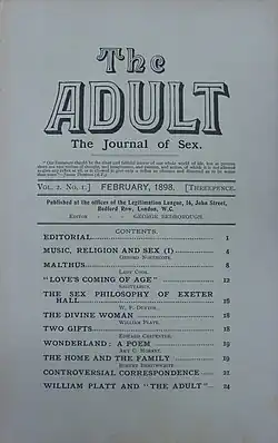 The League's journal, The Adult was published from 1897 to 1899, with the subtitles "A Journal for the Advancement of Freedom in Sexual Relationships" and "A Crusade Against Sex-Enslavement".[3] Lillian Harman wrote multiple articles for the journal.[5] It was originally edited by League's secretary George Bedborough, whose wife Louie was treasurer,[6] before his arrest in 1898 for selling a copy of Havelock Ellis' Studies in the Psychology of Sex Vol. 2.[7] The League as a suspected anarchist organisation, had been under surveillance by Scotland Yard who used Bedborough's arrest as an opportunity to successfully destroy the League.[4] After pleading guilty to the charge of obscenity, Bedborough agreed to no longer be associated with the League.[8] Henry Seymour replaced Bedborough as editor until its last issue in March 1899.[8]