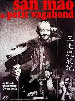 The Adventures of Sanmao the Waif (also known as The Winter of Three Hairs, Wanderings of Three-Hairs the Orphan or An Orphan on the Streets) (三毛流浪记) is a 1949 Chinese film released by Kunlun Film Company, directed by Zhao Ming [1] and Yan Gong, and written by Yang Hansheng, Chen Baichen, and Li Tianji.[2] The 1949 film is based on the Sanmao comic, created by Zhang Leping in 1935 and features the well-known Chinese cultural symbol of child poverty, Sanmao (meaning "three hairs"), a homeless orphan boy. The film, which stars Wang Longji, follows Sanmao through his adventures surviving and meeting new people on the streets of Shanghai. The film notably works to counterbalance the tragic story of Sanmao with humor and comedy. Sanmao's visual image of a small boy with a big head and three hairs is well known amongst Chinese people both old and young.[3]