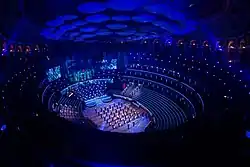 In 1949, the canvas awning was removed and replaced with fluted aluminium panels below the glass roof, in a new attempt to cure the echo; but the acoustics were not properly tackled until 1969 when large fibreglass acoustic diffusing discs (commonly referred to as "mushrooms" or "flying saucers") were installed below the ceiling.[10] In 1968, the Hall hosted the Eurovision Song Contest 1968 which was broadcast on television live in colour for the first time,[23] and from 1969 to 1988 the Miss World contest was staged in the venue.[24]