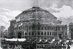 The official opening ceremony of the Hall was on 29 March 1871. This had originally been scheduled for 1 May, the twentieth anniversary of the opening of the Great Exhibition, but was brought forward at the request of Queen Victoria.[5] A welcoming speech was given by Edward, the Prince of Wales because the Queen was too overcome to speak; "her only recorded comment on the Hall was that it reminded her of the British constitution".[10]