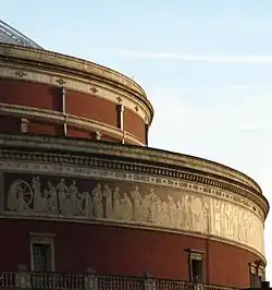 Around the outside of the building is 800-foot–long terracotta mosaic frieze, depicting "The Triumph of Arts and Sciences", in reference to the Hall's dedication.[39] Proceeding counter-clockwise from the north side the sixteen subjects of the frieze are: