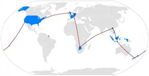 Prior to each of the Races, the production team plans out the locations and tasks that the racers will travel, working in conjunction with local representatives, each of whom Van Munster had initially had available for a different show.[4] The staff also consults with ex-military or federal agents that are aware of political matters in foreign areas, who may advise on countries or regions to avoid.[13] Van Munster and others will then travel the proposed course to verify the locations and identify needs for filming for the show.[4] The crew works with local government representatives to assure the safety of the racers while traveling through certain areas of the world.[11] Despite pre-planning, the production crew may be faced with obstacles forcing them to change tasks or even locations. In one situation during planning of the second race, the Argentine bank system failed, creating political unrest, and a new country was selected.[4][13] Similarly, after the Egyptian Revolution of 2011 and the sexual assault of South African-American reporter Lara Logan who worked for CBS, the production staff considers Egypt to be "off the map right now."[13] While filming had started on the 33rd season of the race in early February 2020, CBS temporarily stopped production and ordered all teams and staff back to the United States due to the COVID-19 pandemic out of caution, though stated that the virus had not been contracted by anyone on the show. At the time, three episodes of the season had been filmed and no new production start date for the series had yet been determined.[14] In 2023, van Munster said that they would not be traveling to Russia, Mainland China, and certain parts of West Africa for the foreseeable future.[15] It has been estimated, by Van Munster, that over 2,000 people worldwide are involved in the production of any one season of the Race.[4]