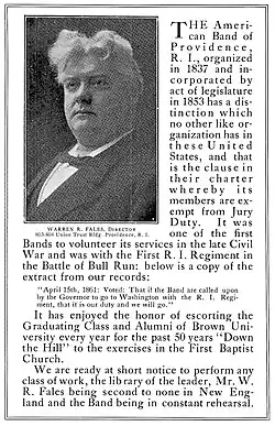 A 1914 advertisement listed Warren R. Fales as the director of the band, and noted that band members "are exempt from Jury Duty."[5] The ad noted that the band had performed at Brown University's commencement "every year for the past 50 years."[5]