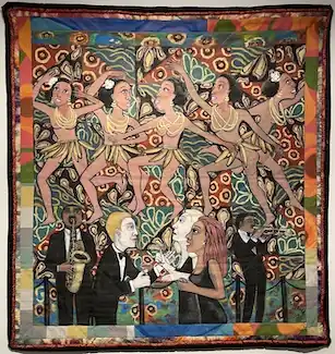 Each quilt is made with acrylic paint on canvas, bordered by patterned fabric; they do not contain written text like the previous quilt series. The quilts continue the story of Willia Marie Simone and her descendants that Ringgold began in The French Collection. The American Collection focuses on Willia Marie's daughter Marlena who, after being raised by her mother's Aunt Melissa in Harlem while her mother was living as an artist in Europe, becomes an artist herself.[3] Ringgold's daughter described the conceit of the series:
