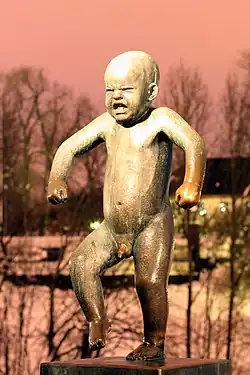 "The Angry Boy" shows a naked, chubby little boy clenching his fists, raising his shoulders and right leg, and screaming in anger while standing on one foot. It is one of four child figures, two boys and two girls, placed in the central section of the Bridge. The statues of children, women, and men on the bridge stand on the railing. "The Angry Boy" is positioned on the corner of the central section facing south.[1] It is about one meter high, including a square base plate measuring 30 x 30 cm. The bridge sculptures were modeled by Vigeland between 1926 and 1933.[2]