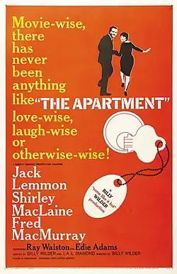 The Apartment is a 1960 American romantic comedy-drama film directed and produced by Billy Wilder from a screenplay he co-wrote with I. A. L. Diamond. It stars Jack Lemmon, Shirley MacLaine, and Fred MacMurray, with Ray Walston and Edie Adams in supporting roles.