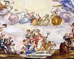 The Apotheosis of Washington depicts George Washington sitting among the heavens in an exalted manner, or in literary terms, ascending and becoming a god (apotheosis), Jupiter Indiges. Washington, the first U.S. president and commander-in-chief of the Continental Army during the American Revolutionary War, is allegorically represented, surrounded by figures from classical mythology.