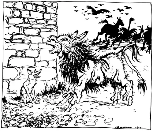 Of the two Greek versions of this story, the one catalogued as number 188 in the Perry Index concerns an ass that puts on a lion's skin, and amuses himself by terrifying all the foolish animals. At last coming upon a fox, he tries to frighten him also, but the fox no sooner hears the sound of his voice than he exclaims, "I might possibly have been frightened myself, if I had not heard your bray." The moral of the story is often quoted as, clothes may disguise a fool, but his words will give him away.[1] It is this version that appears as Fable 56 in the collection by Babrius.[2]