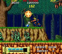 The arcade version of Astyanax is set in a fantasy world populated by mythical creatures from Greek and Arab mythology. The game consists of six stages: a forest, a cave, a lake, a lift, a castle and the final battle. Up to two players can play simultaneously with continues allowed at any moment. The first player controls Roche (a blond-haired warrior in blue armor), while the second player controls an unnamed palette swap of Roche in red armor with black hair. The controls consist of an eight-way joystick and three buttons for attacking, jumping or using a thunder attack that covers the whole screen. The player has four health points per life.