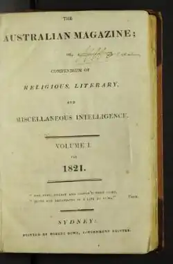 The Australian Magazine appeared monthly in Sydney, New South Wales, between May 1821 and May 1822.[1] It was Octavo in size, contained 32 pages and individual copies sold for two shillings and sixpence per issue.[2] Those who took out an annual subscription paid a reduced amount of one shilling and threepence per issue.[3] Readers from as far away as Hobart subscribed to the publication.