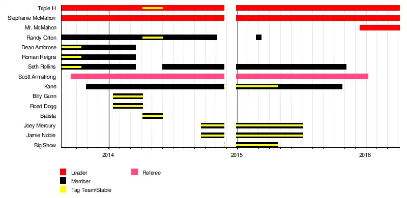The stable was led by company executives Triple H and Stephanie McMahon. Many other wrestlers were a part of the group, most prominently including Randy Orton as The Authority's hand-picked champion and "Face of the WWE" until November 2014, Seth Rollins as "The Man" until suffering a knee injury in November 2015, and Kane as the "Director of Operations" until October 2015.[3] The Shield (Rollins, Roman Reigns, and Dean Ambrose) formerly acted as The Authority's main henchmen to offer protection or carry out attacks until March 2014.[4]