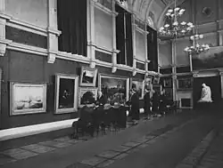 The painting made its public debut at the Royal Academy in 1875, where it drew large crowds and won widespread acclaim.[29] The art critic John Ruskin praised the painting and highlighted the similarity between its subject matter and modern European marriage practices, which Ruskin thought were also mercenary and immoral.[30] It is noted that audiences at the time had a taste for exotic eastern artefacts and narratives.[31] The work was displayed in a gold painted frame.[32] The frame was embossed with numeric Roman numeral script, each numeral encased in a circle which was positioned directly below each bridal figure in the painting.[32] These numerals were thought to designate the rank of each of the brides.[32]