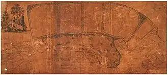 In 1779, Brown presented a plan to the University of Cambridge to create country-house style parkland with its focus on King's College's Gibbs Building. The plan would have involved removing avenues, transforming the river into a lake, and planting clumps of trees to screen the other colleges. It was never implemented, possibly because it would have removed historic college boundaries and three important bridges.[4]