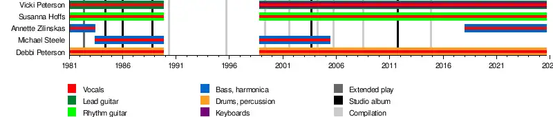 - Annette Zilinskas – bass guitar, occasional backing vocals, harmonica (1981–1983, 2018–present)[46]