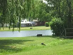 In 1873 the Baltimore, Ohio & Chicago Railroad surveyed a route from Sandusky, Ohio, to Chicago.[4] In spite of intense lobbying from Goshen, Indiana, the county seat, the railroad chose a bee line route through the swamp and hardwoods hugging the north-south Continental Divide. The swamp was the headwaters of the Kankakee River basin, one of the largest fresh-water swamps left in the country at that time. Government drainage programs financed ditches and clay field tile that created some of the most fertile farmland in the Midwest. The timber to the north provided the natural resources for a sawmill industry that by 1885 had 20,000 logs in its yard. A planing mill began building wooden boxes that were shipped to Elkhart, Indiana, to package Dr. Miles' patent medicine, Nervine.