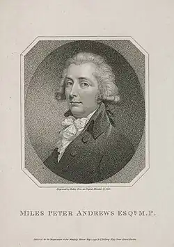 - ^ Morrow, Laura (1989). "Miles Peter Andrews". In Backscheider, Paula R. (ed.). Restoration and Late Eighteenth-Century Dramatists, Third Series. Dictionary of Literary Biography, Vol. 89. Detroit: Gale Research. pp. 3–11, at 9. ISBN 0810345676. Retrieved 6 July 2025.