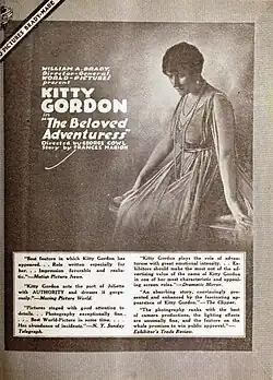 The Beloved Adventuress is a lost[1] 1917 silent film drama directed by William A. Brady, George Cowl and Edmund Lawrence. It stars Kitty Gordon and was scripted by Frances Marion. It was distributed by World Film Company.[2][3]