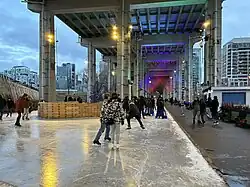 In the winter, part of The Bentway is converted into a public ice skating trail and exhibits public art by local artists.[17] During the 2022-2023 season, Shellie Zhang's installation Beacons was on display.[18][17] During the 2023-2024 season, Canadian artistic duo Yi Zhou and Carlos Portillo’s installation The Gateway is on display. [19]