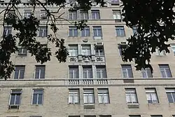 The lowest three stories of the facade are made of rusticated blocks of limestone, while the rest of the building is clad with beige brick. The facade's primary elevations face south toward 81st Street and east toward Central Park West.[25][26] This design was intended to take advantage of the building's placement next to the AMNH and Central Park.[25] The north elevation on 82nd Street is simpler in design than the primary elevations, while the west elevation is not decorated.[28] The north, south, and east elevations contain terracotta ornamentation such as pilasters, broken pediments, balustrades, obelisks, and cartouches.[25] There are also motifs such as angels, dolphins, and rams' heads.[1][35] The corners of each elevation are articulated by vertical bands of brick quoins.[25] There are horizontal band courses above the 9th, 12th, and 13th stories; each band course consists of two molded terracotta bands.[28]