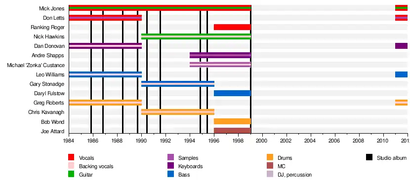 | Big Audio Dynamite (1984–1990) | Big Audio Dynamite II (1990–1993) | Big Audio (1994–1995) | Big Audio Dynamite (1996–1998) | Big Audio Dynamite (2011) | |
