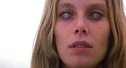 The white contact lenses worn by several actors in the film were made of glass and hand-painted with multiple shades of white enamel.[26] They were described by both MacColl and Warbeck as being very uncomfortable; MacColl recalled that after completing the film's finale sequence, both she and Warbeck had difficulty removing them from their eyes.[20] The lenses also obscured the wearer's vision, rendering them completely or nearly-completely blind.[22] Monreale expressed that wearing the lenses was extremely difficult for her; all of her scenes except one required her to wear them, and she had to rely on the film's makeup artist, Maurizio Trani, for assistance navigating the sets.[22] To minimize discomfort, Trani would regularly remove the lenses from the actors' eyes and disinfect them between takes.[26]