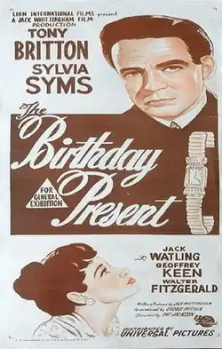 The Birthday Present is a 1957 British drama film directed by Pat Jackson and starring Tony Britton and Sylvia Syms.[1][2] The screenplay was by Jack Whittingham who also produced the film for British Lion Films.