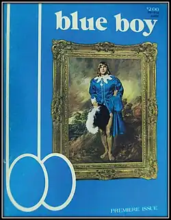 In 1974, former TV Guide advertising manager Don N. Embinder (a.k.a. Don Westbrook) published the first issue of Blueboy Magazine, an upscale, gay bi-monthly magazine with nude photography, slick advertisements, and articles by writers such as Christopher Isherwood and Randy Shilts. Rescuing Gainsborough's Blue Boy from sissiness, Embrinder introduced him as the embodiment of the recently liberated gay man. The premier issue featured a bright blue cover with a photograph of a young man dressed up as Gainsborough's boy in blue from the waist up. Embinder re-appropriated Gainsborough's Blue Boy from the funny pages and transformed a derogatory stereotype into an emblem of pride.[12]