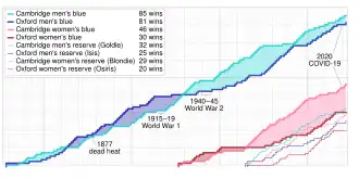 Because of World War I and II, the race was completely cancelled in 1915–1919 and 1940–1945. On 12 January 1915, The Daily Telegraph announced that the annual race was completely cancelled due to men leaving for war, "for every available oarsman, either Fresher or Blue, has joined the colours."[25]
