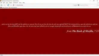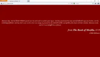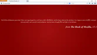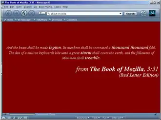 There is no real book titled The Book of Mozilla. However, apparent quotations hidden in Netscape and Mozilla give this impression by revealing passages in the style of apocalyptic literature, such as the Book of Revelation in the Bible.[6] When about:mozilla is typed into the location bar, various versions of these browsers display a cryptic message in white text on a maroon background in the browser window.