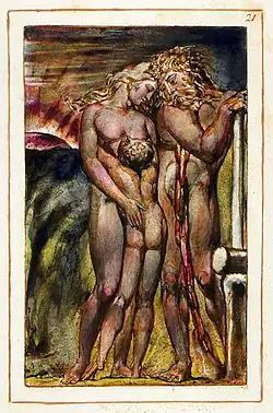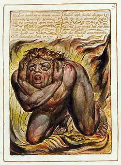 The Book of Urizen is a creation myth that is similar to the Book of Genesis.[6] Blake's myth surrounding Urizen is found in many of his works and can trace back to his experiments in writing myths about a god of reason in the 1780s, including in "To Winter".[13] In the work, Urizen is an eternal self-focused being who creates himself out of eternity. This creation is taken up again in The Four Zoas with a primal man, Albion, being the original form. In this work, it is only Urizen, the representation of abstractions and is an abstraction of the human self. From himself he first divides unknown shapes that begin to torment him. He also turns against the other Eternals and believes himself holy. In contemplating himself, he is able to discover sins and records them in a book of brass that are a combination of Newton, the laws of Moses, and deism that force uniformity. The rest of the Eternals in turn become indignant at Urizen's turning against eternity, and they establish the essence of the sins within living beings. This torments Urizen, who falls into a sleep, which allows Los to appear. Los' duty within the work is to watch over Urizen, and Urizen is seen as an eternal priest while Los takes the position of eternal prophet.[14]