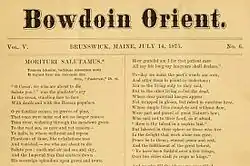 ![]() In July 1875, the paper published Morituri Salutamus, a poem by Henry Wadsworth Longfellow, Bowdoin Class of 1825, delivered for Bowdoin's 1875 commencement. | |