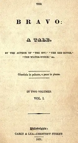 The Bravo is a novel by James Fenimore Cooper first published in 1831 in two volumes. Inspired by a trip to Europe where he traveled through much of Italy, the novel is set in Venice. The Bravo is the first of Cooper's three novels to be set in Europe.[1] This group of three novels, which one critic would call Cooper's "European trilogy", include The Heidenmauer and The Headsman.[2] Like his other novels set in Europe, The Bravo was not very well received in the United States.[3] The book largely focuses on political themes, especially the tension between the social elite and other classes.