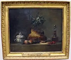 Manet was inspired to paint it after a painting of a brioche by 18th-century artist Jean Siméon Chardin was donated to the Louvre in Paris. In Manet's work the brioche is accompanied by peaches and plums. It is singular among Manet's still lifes for its formality, and mark the last time he would paint such an elaborate tabletop composition.[2]