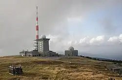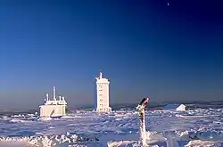 The extreme weather conditions of the Brocken are of special meteorological interest. From 1836 the Brockenwirt, who also ran the guest house and restaurant, kept meteorological records. The first weather station on the Brocken was built in 1895. Technically poor and too small, it was partially demolished in 1912 and replaced with a large stone construction, the Hellman Observatory, that was not completed until the First World War. In 1917 the academic and nature lover George Grobe took over running the observation post, his daughter supporting him until his death in 1935.[21] Today's weather station started life in 1939. Measurements were interrupted at the end of the Second World War as a result of military bombardment, but began again in 1947. On 16 March 2010 the Brocken Weather Station became a climate reference station to provide uninterrupted, long-term climatic observations.[22]