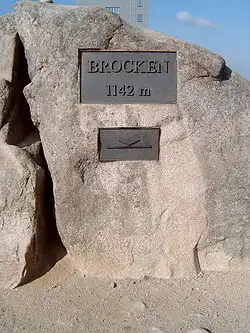 Before 1989 the height of the Brocken was recorded in almost all the relevant maps and books as 1,142 m above NN (3,747 ft). A survey of the summit at the beginning of the 1990s based on the current reference system, however, gave the height as 1,141.1 m (3,744 ft). In order to provide a reference point for the old data, granite boulders were set in the mid-1990s on the highest point of the Brocken to a height of approximately 1143 m, and a benchmark of "1142 m" was established on them.[1]