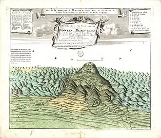 The widespread use of the name "Brocken" did not occur until towards the end of the Middle Ages. Hitherto the region had just been described as the Harz. This was primarily because, until then, the focus had been mining.[12] The first record of a placename that resembles the present name of the mountain goes back, however, to the year 1176 when it is referred to as broke in the Saxon World Chronicle (Sächsische Weltchronik).[13] Another early written reference to the mountain, this time as the Brackenberg, appears in 1490 in a letter from Count Henry of Stolberg.[14] Other early documented names of the Brocken were, in 1401, the Brockenberg, in 1424 the Brocberg, in 1495 mons ruptus (Latin), in 1511 the Brogken and Brockin, in 1531 the Brogken, in 1540 the Brokenberg and, in 1589, the Brackenberg.[15] In Old Saxon-Germanic times, a large portrait of Wodin is supposed to have been found on the Brocken. In addition, animal and human sacrifices were offered by the Saxons to their supreme god, Odin, on the blockfields of the summit until they renounced them as part of their baptismal vows when Christianity spread to the region under Charles the Great.[16]