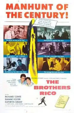 The Brothers Rico is a 1957 American crime film noir directed by Phil Karlson and starring Richard Conte, Dianne Foster and Kathryn Grant.[1]