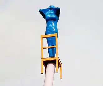 The Calling is an outdoor sculpture by Paddy McCann located in Belfast, Northern Ireland.[1] Located at the junction of Gordon Street and Dunbar Junction,[2] it consists of a bright red stylised male human figure calling into the distance while standing on an ordinary chair atop an extended (and angled) piston-like arm. A similarly mounted blue female figure, opposite the first, calls back across the square.[3] It was installed in 2003.[4]