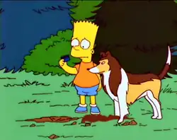 Bart visits Mitchell to beg for his dog back, but he sees that the man is blind because he fails to notice his parrot has died. When Bart hears how the man and Santa's Little Helper have bonded, he grows heartsick and leaves. Later, Bart makes a late-night visit to the man's home and retrieves Santa's Little Helper. While trying to escape, he traps himself in a closet after mistaking it for an outside door. Thinking Bart is a burglar, Mitchell gloats that he has called the police. Bart explains that he is just a child and the dog was originally his. Bart and Mitchell call to Santa's Little Helper, so he can decide which owner he prefers. After briefly getting distracted by chasing his own tail, Santa's Little Helper chooses Bart. Chief Wiggum arrives with Laddie, who immediately sniffs out a bag of marijuana in Mitchell's pocket. As Bart and Santa's Little Helper head home, more police officers arrive to enjoy the confiscated cannabis.