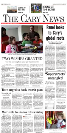 It was published twice weekly and freely distributed for free to residents of Cary, North Carolina and Morrisville, North Carolina. In 2011, The Cary News won four awards from the North Carolina Press Association in the large community newspaper category for news reporting, sports columns, appearance and design, and photography.[3] In 2009, the paper won for sports columns, features, and coverage as well as an award for multimedia.[4] In 2008, the paper won awards from the NCPA for multimedia project, sports columns, sports coverage, and the website.[5]